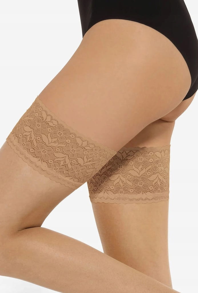 Pończochy damskie samonośne wykonane z przędz typu elastan.
