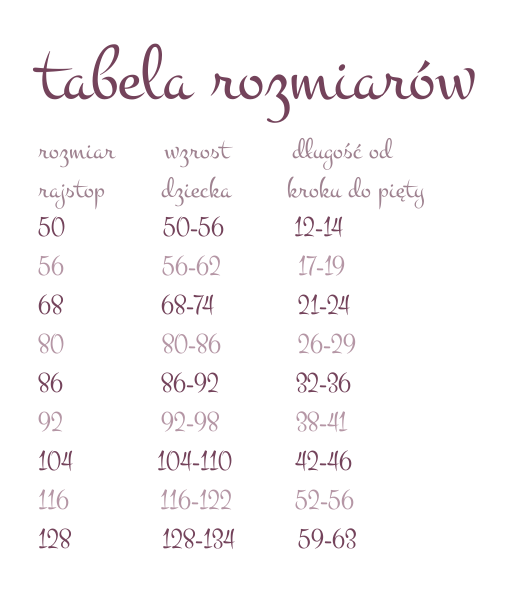 Rajstopki dziecięce bawełniane z domieszką włókien elastycznych, która powodują, że rajstopki "rosną z twoim dzieckiem". Rajstopki średniej grubości, idealne na każdą pogodę. Przy maluchach swobodnie włożysz je na pieluszkę. Rajstopki maja profilowane piętki oraz płaski szew, nie uwierają więc w paluszki. W pasie jest bardzo delikatna i szeroka guma. Rajstopki są wygodne i nie mechacą się. Idealnie dolegają do nóżek. Właściwy rozmiar uzyskują po praniu.
